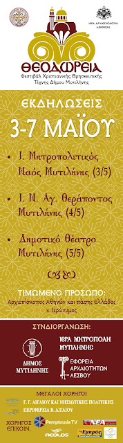 Για δεύτερη συνεχή χρονιά σας προσκαλούμε στο Φεστιβάλ Χριστιανικής Μουσικής και Τέχνης του Δήμου Μυτιλήνης με τίτλο «Θεοδώρεια» καθώς και στις Ιερές Ακολουθίες προς τιμήν του Πολιούχου του Νησιού μας Αγίου Θεοδώρου του Βυζαντίου. Στόχος μας ο Αγιοτόκος τόπος μας με τη μεγάλη θρησκευτική πολιτιστική παράδοσή να αναδειχτεί ανάλογα κατά πως του αξίζει σε τόπο προβολής και ανάδειξης της Χριστιανικής Τέχνης σε όλα τα επίπεδα κεντρική μορφή τον πολιούχο του Άγιο.